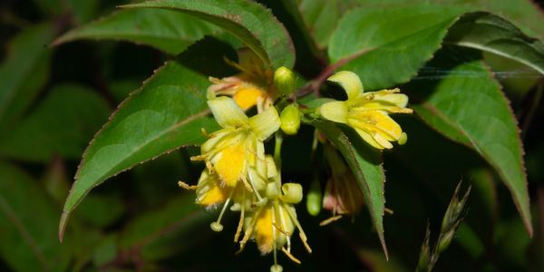 (False spirea; yellow foliage in spring, pink flowers on red stems) 3 planted in 2014; South side, woodland
