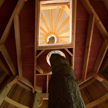 A 40 foot long bridge, elevated above the woodland floor, leads to the spiral staircase.