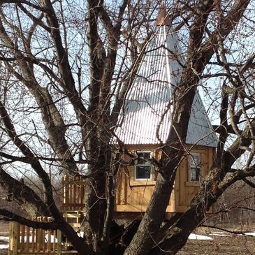 "The Pentagon" rests amongst the branches of an Acer saccharinum (silver maple) on a farm in Kendall, New York. Inspired by surrounding barns, the base was constructed of rough sawn lumber and sits twelve feet off the ground. The corrugated steel roof rises to a towering height of twenty-eight feet. The 56 square foot interior includes fully functional windows and a trap door. A rear outside deck is perfect for enjoying the farmland views.
