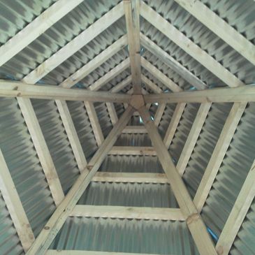 "The Pentagon" rests amongst the branches of an Acer saccharinum (silver maple) on a farm in Kendall, New York. Inspired by surrounding barns, the base was constructed of rough sawn lumber and sits twelve feet off the ground. The corrugated steel roof rises to a towering height of twenty-eight feet. The 56 square foot interior includes f